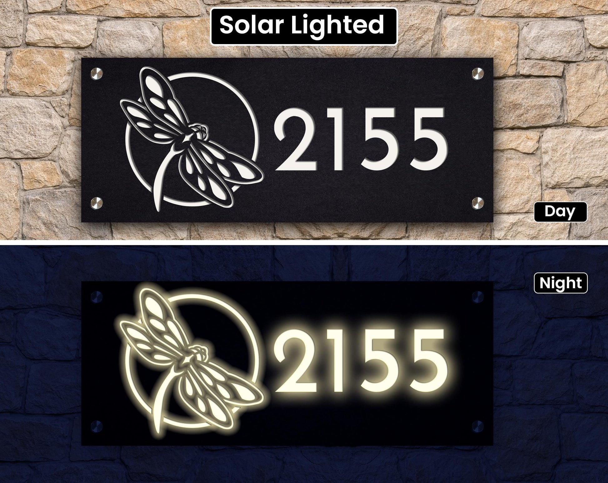 Solar Lighted Address Sign with Dragonfly – Modern House Numbers Plaque